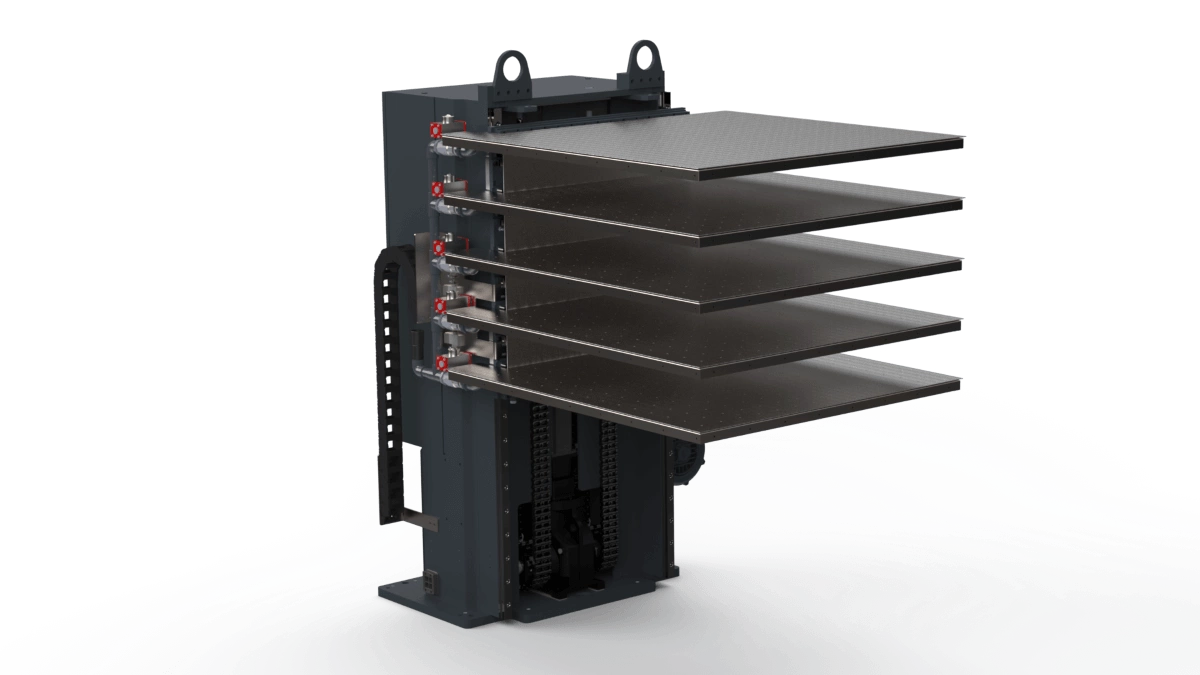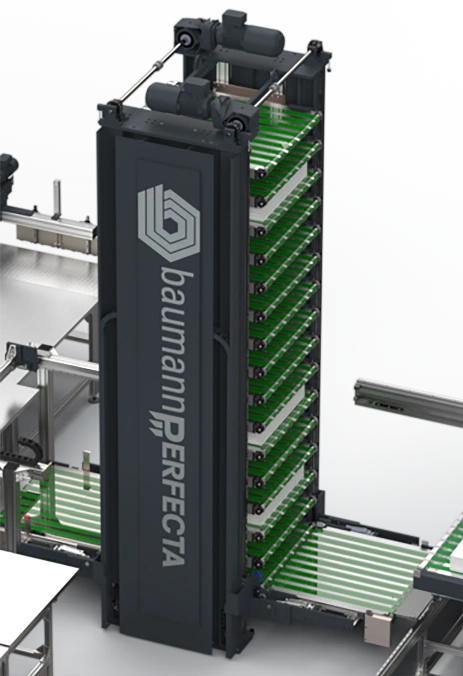 El buffer vertical baumannperfecta BVP es la solución ideal para el almacenamiento intermedio de capas alineadas que deben transferirse a la guillotina de alta velocidad. Tanto si el corte es manual como totalmente automático, con el buffer vertical siempre se dispone de capas vibradas y alineadas listas, evitando así tiempos muertos en el proceso de corte.